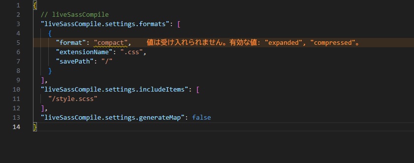 久々に「compact」を使う機会があったので、颯爽と「settings.json」を修正したところ、この画面ですよ。