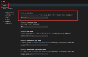 「設定の検索」窓にて「theme」を入力すると、テーマ回りの設定が表示されます。